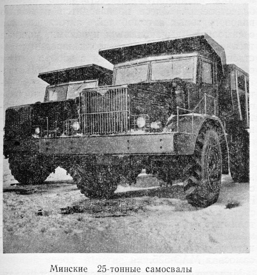 Особенно широкую известность получил на больших стройках самосвал МАЗ-525 – самое крупное детище минских автомобилестроителей с дизельным двигателем в 300 лошадиных сил. Необходимость в такой машине возникла в связи с созданием советскими машиностроителями первых шагающих экскаваторов, поднимающих в ковше 14 кубометров земли. Принять груз такого ковша смог только 25-тонный самосвал МАЗ-525.